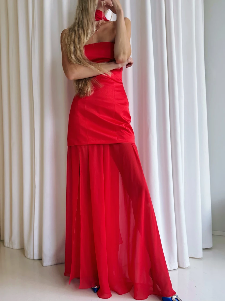 Noelle on kaunis kahes versioonis kantav kleit, mis ühendab endas minimalismi ja elegantsi. Klassikaline rinnaosaga lühike kleit muutub hetkega glamuurseks õhtukleidiks tänu õhulisele läbipaistvale pikale seelikule, millel on pikk lõhik. Satiinkangas toob esile naiselikkuse ja graatsia, samas kui stiilsed detailid annavad võimaluse mänguliselt stiili muuta vastavalt sündmusele.