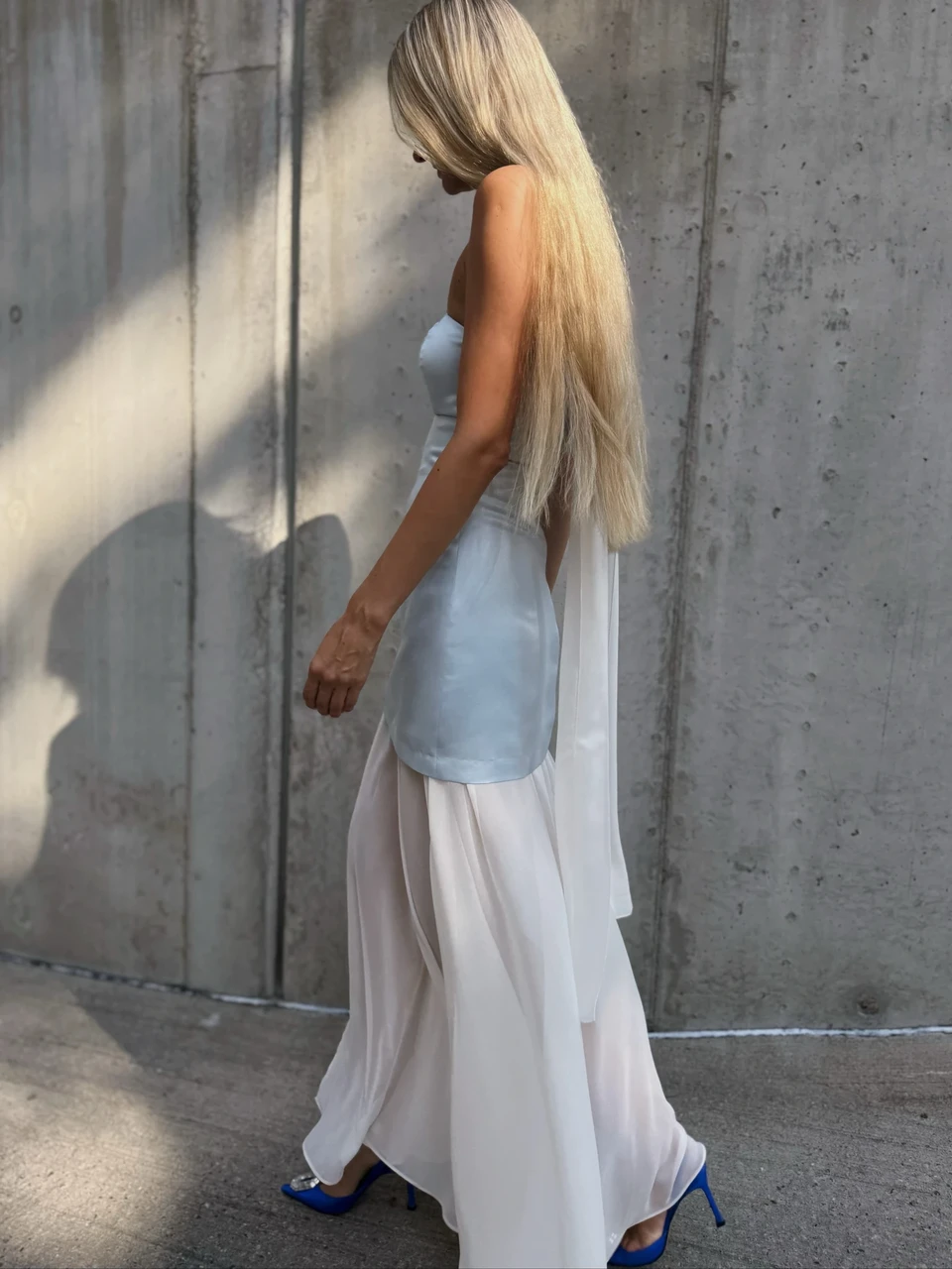 Noelle on kaunis kahes versioonis kantav kleit, mis ühendab endas minimalismi ja elegantsi. Klassikaline rinnaosaga lühike kleit muutub hetkega glamuurseks õhtukleidiks tänu õhulisele läbipaistvale pikale seelikule, millel on pikk lõhik. Satiinkangas toob esile naiselikkuse ja graatsia, samas kui stiilsed detailid annavad võimaluse mänguliselt stiili muuta vastavalt sündmusele.