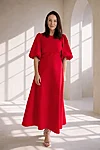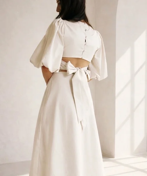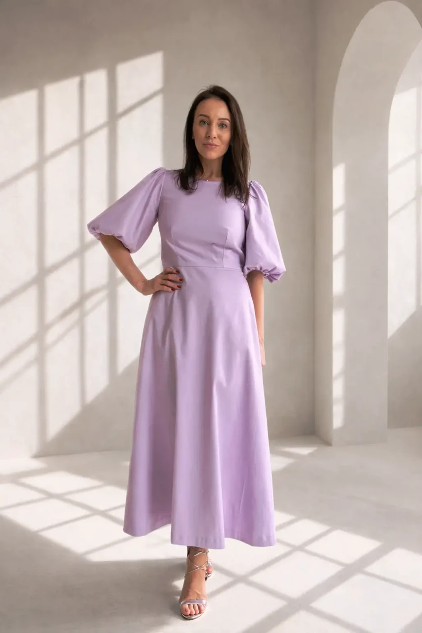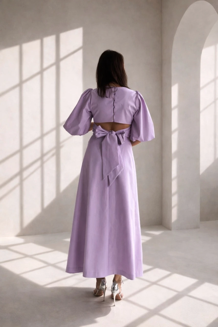 Kleit on valmistatud kaunilt langevast kangast, mis hoiab vormi ja liigub kergelt iga sammuga. Volüümikad varrukad lisavad karakterit, samas kui taljesse lõige rõhutab figuuri. Seljaosa on eriline pilgupüüdja – elegantne avatud detail ja siduv lips loovad naiseliku ja meeldejääva terviku.