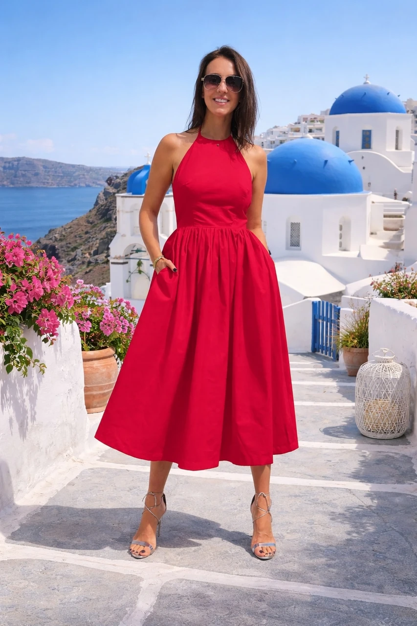 - Halterneck, avatud õlad, praktilised küljetaskud
