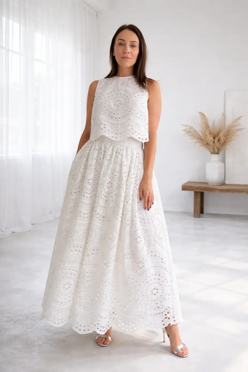 Delikaatne broderii tikand lisab tekstuuri ja luksuslikku sügavust. Läbimõeldud lõige tagab mugavuse ning kauni langevuse igal sammul.