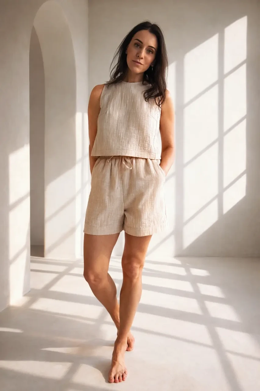 Pehme tekstuuriga musliinkangas on hingav ja nahasõbralik, mistõttu sobib komplekt ideaalselt nii soojemateks päevadeks kui ka kihiliseks kandmiseks. Minimalistlik lõige ja neutraalne toon muudavad selle lihtsasti kombineeritavaks teiste garderoobi lemmikutega.