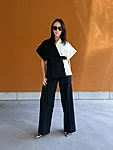 - Püksid: saadaval 2 varianti- kõrge pihaga, taskuteta, rohkem ümber puusast, ees läbiõmmeldud viik, mis muudab säärejoone visuaalselt pikemaks ja hoiab püksid alati korrektse väljanägemisega. Kogupikkus koos värvliga 110cm ja kõrge pihaga, taskutega, puusast vabam tegumood, ees klassikaline volt ja viik, tripid vöö jaoks.