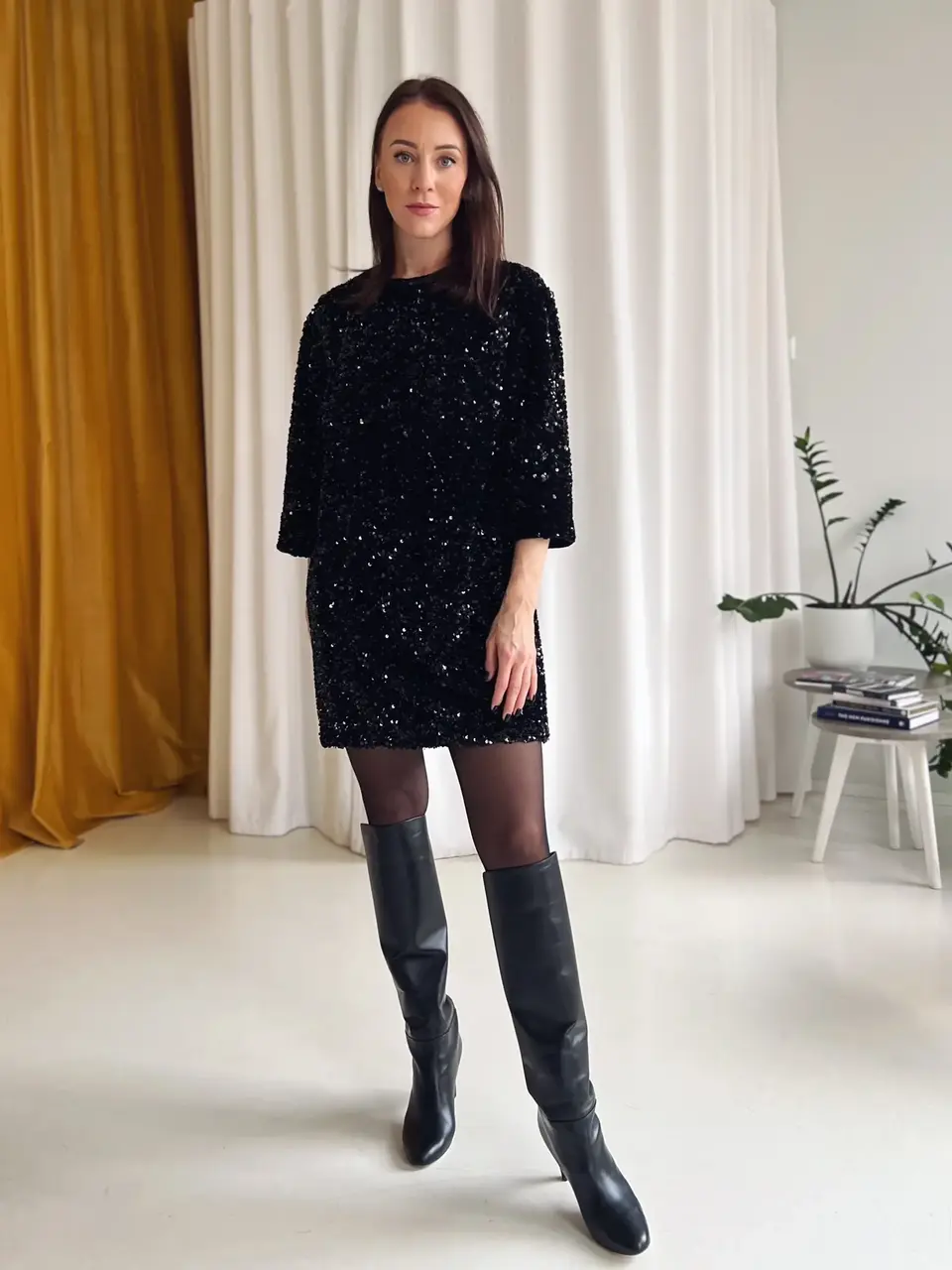Ajatu ja elegantne must sädelev kleit, mis sobib nii pidulikeks sündmusteks kui ka õhtusteks väljaminekuteks. Kleit on kaetud litritega, mis püüavad valgust igast liikumisest, luues luksusliku ja samas minimalistliku efekti. Lõige on sirge ja mugav, 3/4 varrukad lisavad šikki lihtsust.