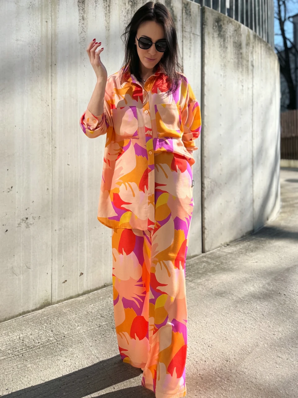 Tõsta oma stiil uuele tasemele selle luksusliku lounge-komplektiga. Julged värvid ja elegantsed mustrid loovad ainulaadse koosluse, kus ajatu kunst kohtub kaasaegse mugavusega. Komplekt koosneb avarast nööbitavast särgist ja laiade sääredega pükstest, mis tagavad maksimaalse vabaduse ja stiilsuse – nii kodus kui ka tänaval.